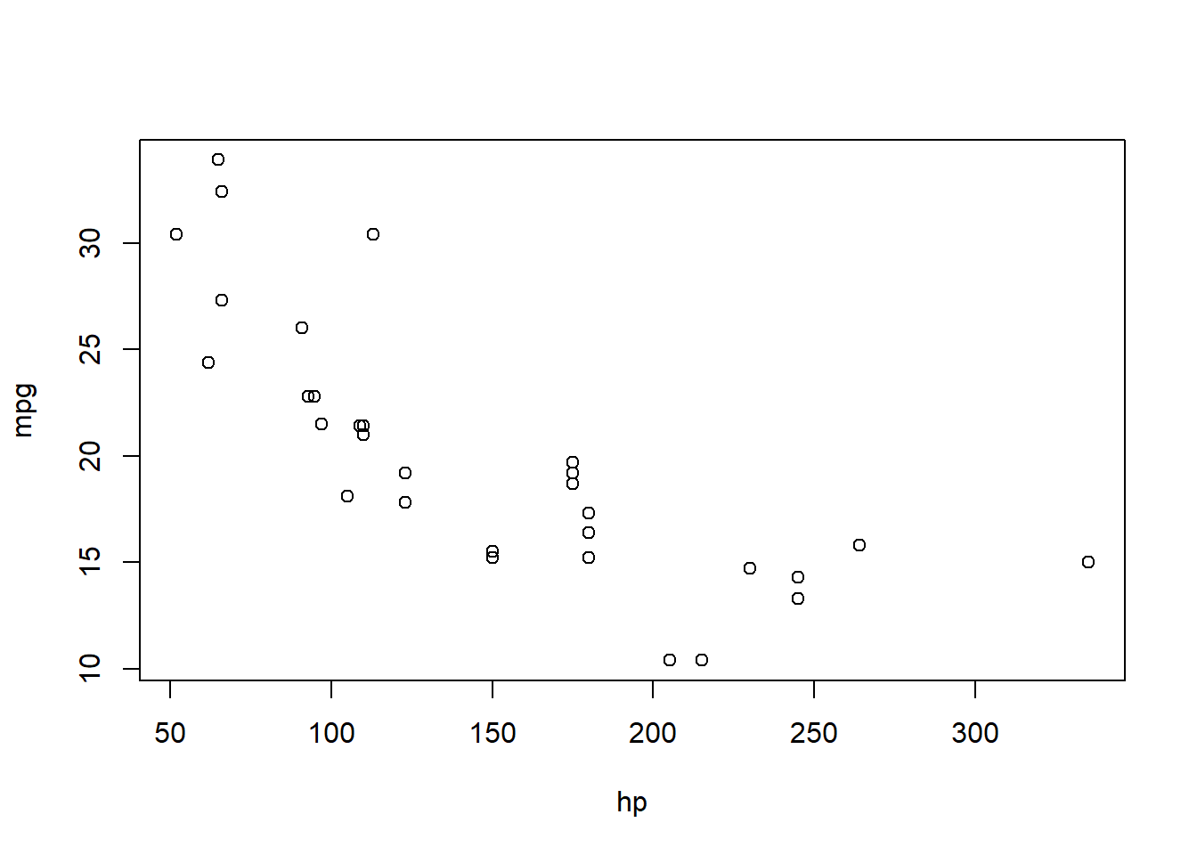 plot(x = hp, y = mpg) # plot(hp, mpg)