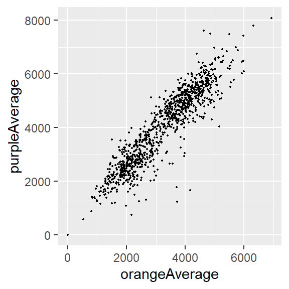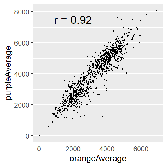 ggplot(aes(x = orangeAverage, y = purpleAverage)) +